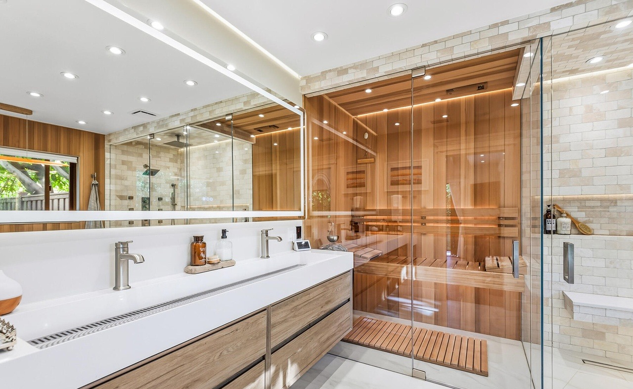 Double VanityFloating VanityWalk In ShowerFrameless Glass ShowerLarge MirrorRecessed LightingCustom MillworkSauna