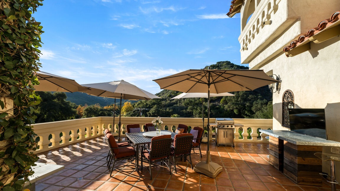 A stunning Mediterranean-inspired outdoor kitchen overlooking verdant hillside vistas, featuring warm terracotta tile flooring, cream-colored plaster walls with decorative balustrade railings, and a sophisticated stone-topped built-in grill station. The space combines Old World charm with contemporary outdoor living amenities, creating an elegant alfresco entertaining destination with dramatic mountain views and ample natural light beneath protective canvas umbrellas.