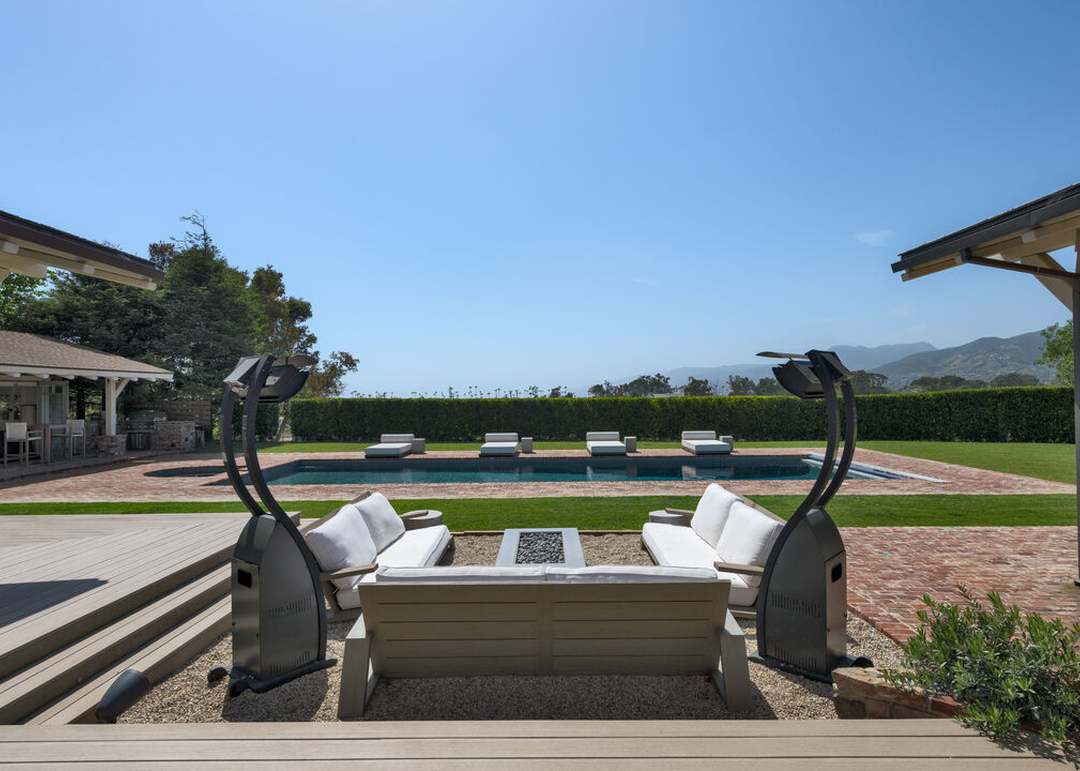 An expansive contemporary patio showcasing a sophisticated outdoor living experience with a central fire pit flanked by white upholstered lounge seating, overlooking a resort-style pool surrounded by manicured lawn and professional landscaping. The minimalist design pairs natural stone pavers with modern black metal fixtures and a pergola, creating seamless indoor-outdoor living with mountain views and abundant natural light.