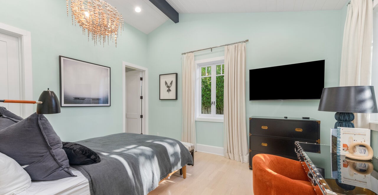 A serene primary bedroom featuring soft mint-green walls, vaulted ceilings with exposed beams, and abundant natural light from floor-to-ceiling windows. The space balances cool tones with warm brass accents and statement lighting, creating a sophisticated yet inviting retreat with clean-lined furnishings and thoughtful material selections.