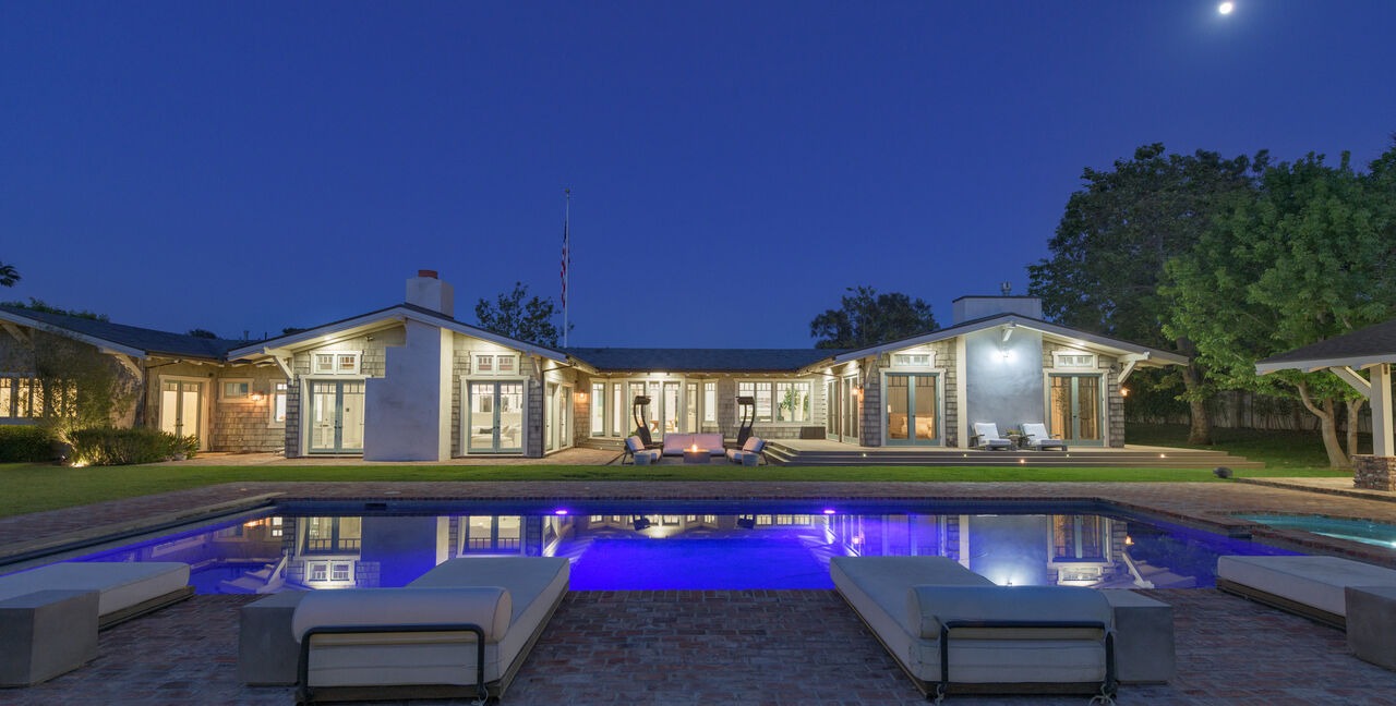 A stunning mid-century modern estate pool area featuring a resort-style saltwater pool with vibrant blue LED lighting, framed by clean-lined contemporary pavilions with expansive glass walls and pale wood trim. The sophisticated composition blends indoor-outdoor living with manicured landscaping, lounge seating with purple-toned cushions, and professional architectural lighting that creates a cinematic twilight ambiance.
