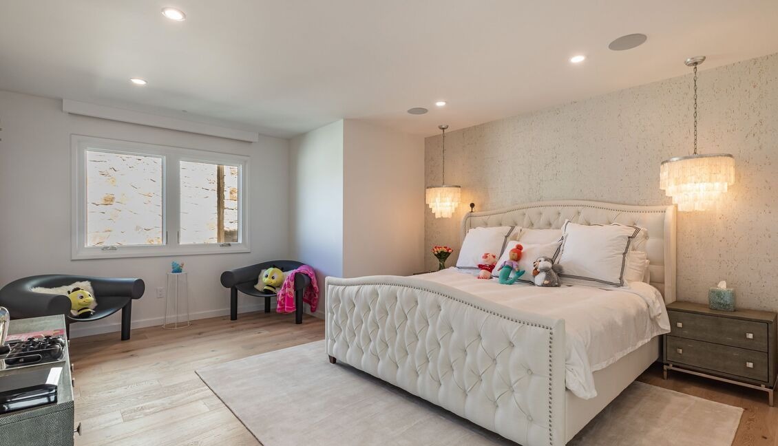 A sophisticated primary bedroom featuring a cream upholstered bed with nailhead detailing, warm brass pendant lighting, and textured wallpapered walls that create a serene, luxurious retreat. The space balances elegant traditional elements like crown molding with modern furnishings and a neutral, airy color palette enhanced by abundant natural light.
