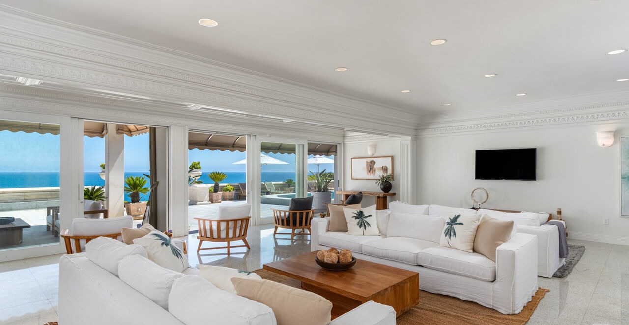 An exceptionally sophisticated coastal living room flooded with natural light through expansive floor-to-ceiling windows overlooking the ocean. The space balances a serene, airy palette of whites and creams with warm wood furnishings and subtle blue accents, embodying high-end transitional design with impeccable finishes and professional composition.