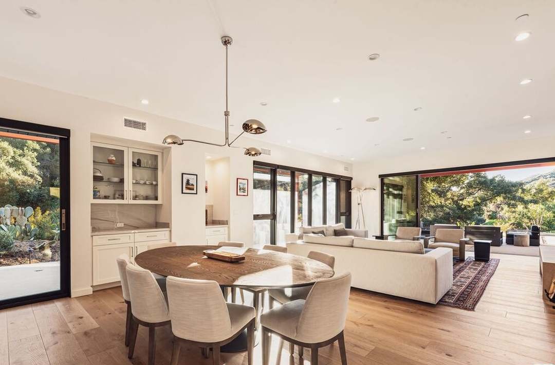 A sophisticated open-concept living and dining space that seamlessly blends organic warmth with modern clean lines, featuring abundant natural light from expansive glass doors, warm-toned hardwood flooring, and a curated palette of cream, white, and natural wood accents. The space exemplifies current luxury residential design with its emphasis on light, materiality, and indoor-outdoor connection, anchored by statement brass lighting and custom built-in cabinetry.