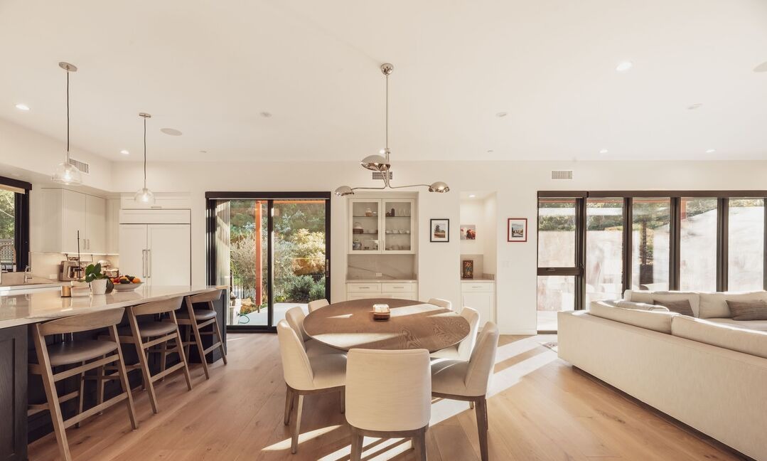 A sophisticated open-concept living space seamlessly blending kitchen, dining, and lounge areas with abundant natural light from expansive glass doors and windows. The design showcases organic modern sensibilities through warm wood tones, creamy whites, and carefully curated brass and bronze accents, with a sculptural wooden dining table and layered custom millwork creating visual interest in this airy, light-filled sanctuary.