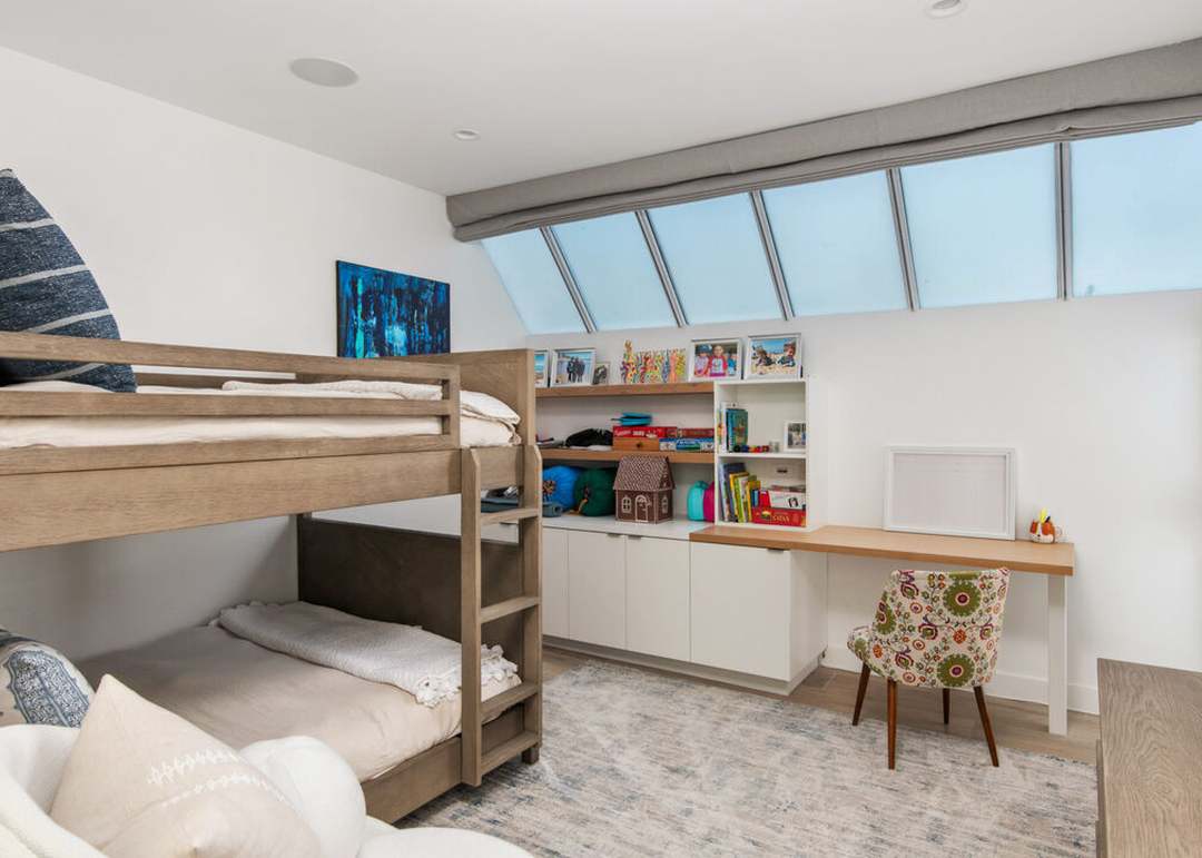 A bright, airy children's loft bedroom featuring a natural wood bunk bed and abundant skylights that flood the space with natural light. The room seamlessly blends Scandinavian minimalism with organic modern warmth, combining white built-in cabinetry, light wood furnishings, and carefully curated colorful accents to create an inspiring yet restful environment.