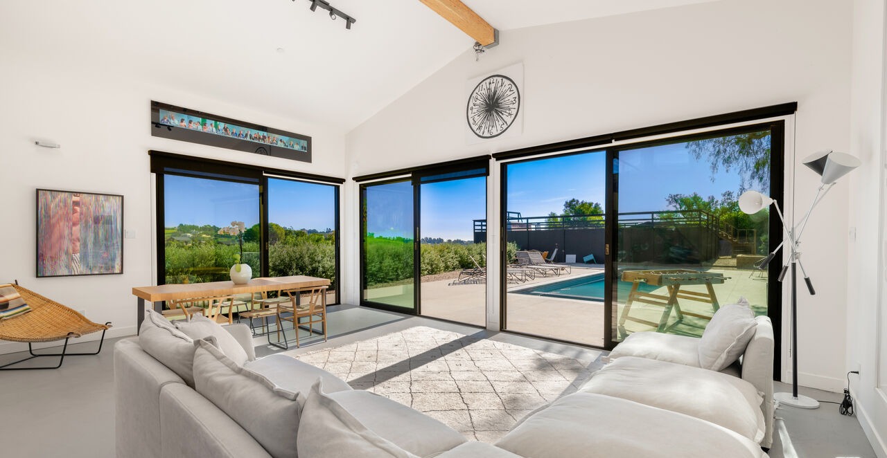A sophisticated open-concept living room flooded with natural light through expansive floor-to-ceiling black-framed glass doors that frame manicured gardens and a swimming pool. The space features warm neutral tones, natural wood beams, creamy linen furnishings, and stone flooring that seamlessly connects interior to exterior, embodying modern design with organic, warm materiality.