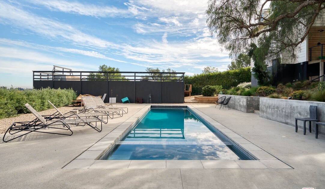 A stunning contemporary pool area featuring a resort-style rectangular pool with crystalline turquoise water set within a expansive gray concrete deck, anchored by a sophisticated black steel pergola structure and complemented by minimalist lounge seating. The design seamlessly blends desert modernism with organic sophistication, with manicured landscaping, clean geometric lines, and professional-grade finishes creating an elevated outdoor living environment with abundant natural light and unobstructed sightlines.