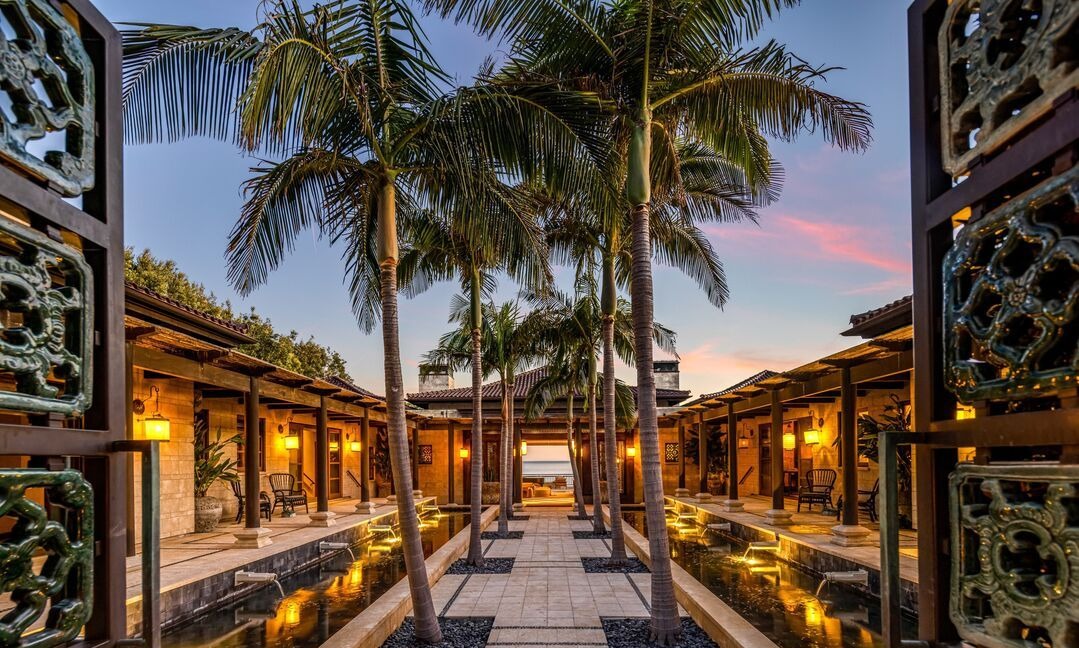 An extraordinarily refined Mediterranean-inspired courtyard with palm-lined stone pathways, ornate carved wooden screens, and warm ambient lighting that creates a serene yet dramatic retreat. The space seamlessly blends indoor elegance with outdoor living through its sophisticated water features, professional architectural detailing, and impeccable material composition.