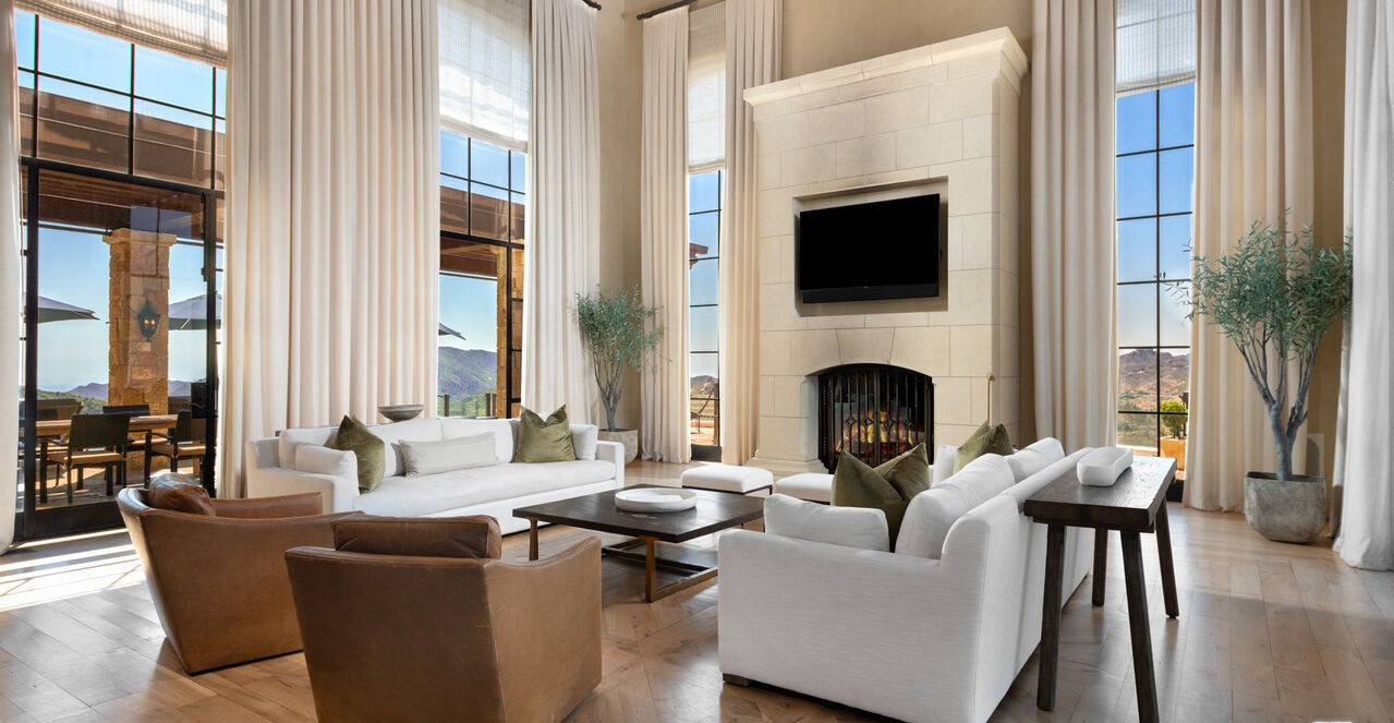 A sophisticated double-height living room featuring a stunning cream stone fireplace with integrated flat-screen TV and black metal surround, anchored by layered seating in cream and white linens with olive-green accents. Floor-to-ceiling windows flood the space with natural light, while polished hardwood floors, strategic greenery, and refined material pairings create a serene yet grand luxury retreat.