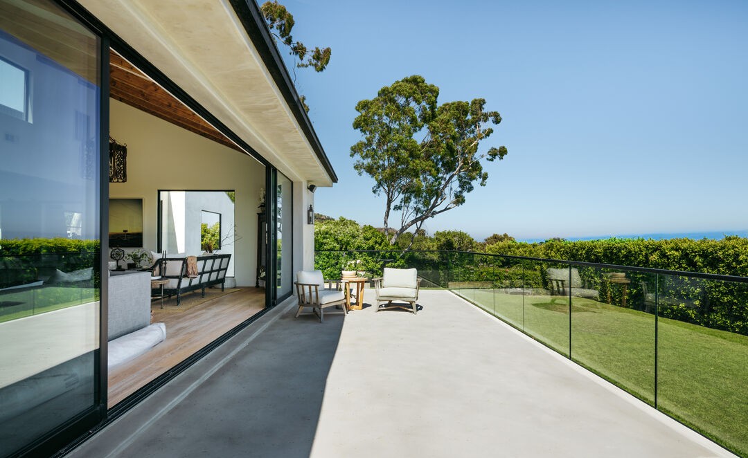 A stunning modern terrace overlooking the Pacific Ocean, featuring seamless indoor-outdoor integration with floor-to-ceiling glass sliders, minimalist glass railings, and warm-toned concrete flooring. The space showcases organic modern design through natural materials, curated seating, and effortless sophistication enhanced by mature landscaping and unobstructed ocean views.