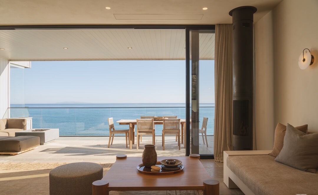 A stunning ultra-luxury coastal living room flooded with natural light through expansive floor-to-ceiling glass doors overlooking the ocean. The warm organic modern design seamlessly integrates natural materials—light wood flooring, cream linen upholstery, natural wood dining furniture, and woven accents—with clean architectural lines, a sophisticated black cylindrical fireplace, and warm brass sconce lighting to create a serene yet refined seaside sanctuary.