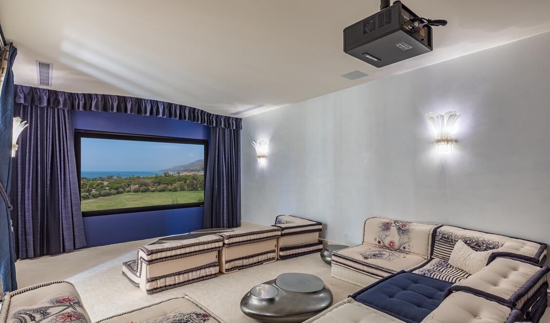A sophisticated home theater featuring premium custom seating arranged in stepped platforms with luxe cream and patterned upholstery, anchored by a striking digital display showcasing a serene coastal oceanscape. The design balances theatrical drama with contemporary elegance through coordinated navy and purple textiles, statement wall sconces, and polished finishes—creating an immersive entertainment space with coastal resort sensibility.