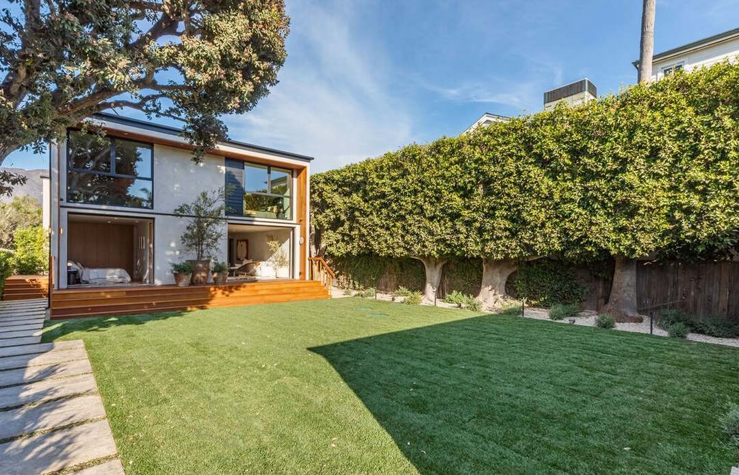 A contemporary outdoor living space seamlessly integrated with a modernist pavilion, featuring a manicured lawn, mature ivy-covered stone walls for privacy, and expansive floor-to-ceiling glass doors that blur the boundary between interior and exterior. The warm wood decking and natural materials create a sophisticated, serene retreat that balances clean modern architecture with organic landscape design.