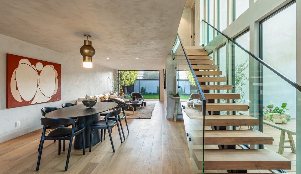 A stunning floating staircase with warm natural wood treads and minimalist glass railings anchors this open-concept living space, flooded with abundant natural light through floor-to-ceiling windows. The design elegantly bridges the dining area and living room with sophisticated materials, a bold red artwork accent, and a striking brass pendant fixture that epitomizes contemporary organic modern luxury.