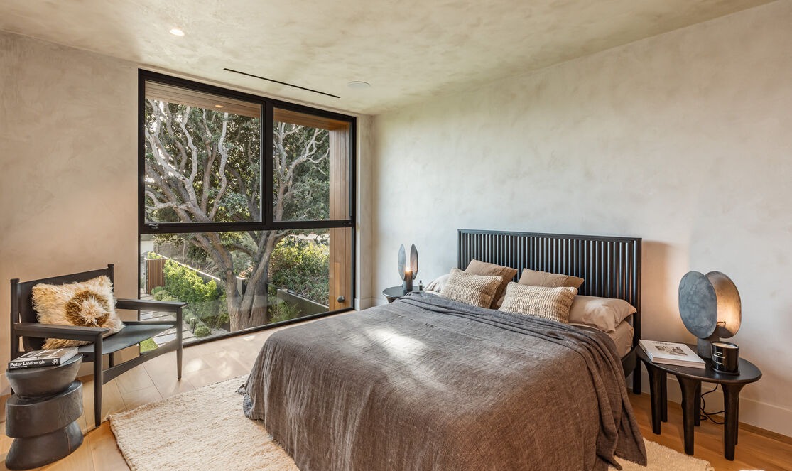 A serene primary bedroom featuring floor-to-ceiling windows framing a mature tree, with warm beige walls, a black slatted headboard, and layered neutral bedding that creates sophisticated depth. The space balances organic warmth with modern minimalism, enhanced by sculptural bronze lighting and natural hardwood flooring, exemplifying contemporary California luxury design.