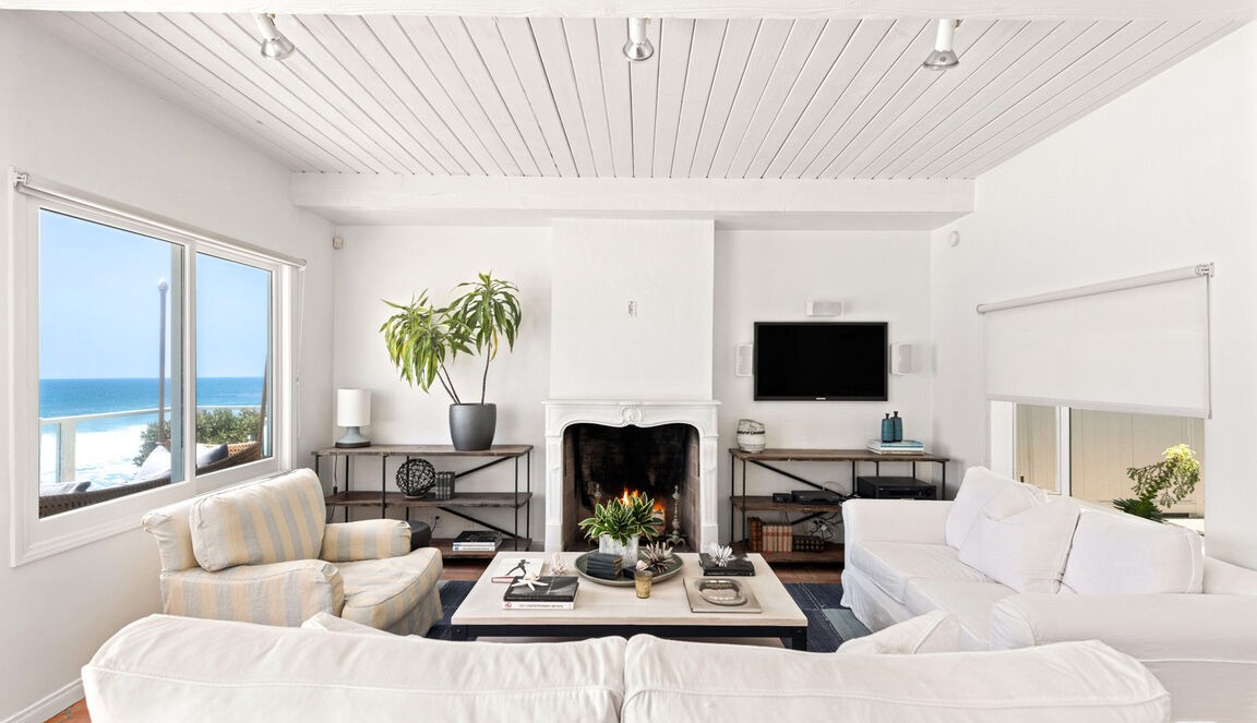 A sophisticated coastal living room with panoramic ocean views, featuring a minimalist white palette accented by a functional black fireplace and open shelving system. The space balances airy, light-filled design with warm hardwood flooring and carefully curated furnishings, creating an effortlessly luxurious retreat.
