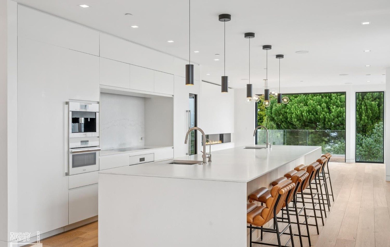 A stunning open-concept kitchen featuring a sculptural waterfall island with pristine white cabinetry and light quartz countertops, complemented by cognac leather bar seating and minimalist black pendant lighting. The space seamlessly integrates with expansive floor-to-ceiling windows overlooking manicured landscaping, creating an airy, serene sanctuary that exemplifies contemporary luxury with warm, organic materials and impeccable craftsmanship.