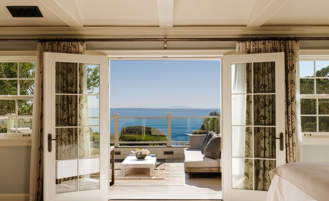 A stunning primary bedroom suite featuring a spectacular ocean-view patio accessible through French doors, with coffered ceiling, sophisticated neutral palette, and exquisite natural light that transforms the space into a serene coastal sanctuary. The transitional design blends classic architectural details like crown molding with modern comfort and an unobstructed coastal aesthetic.