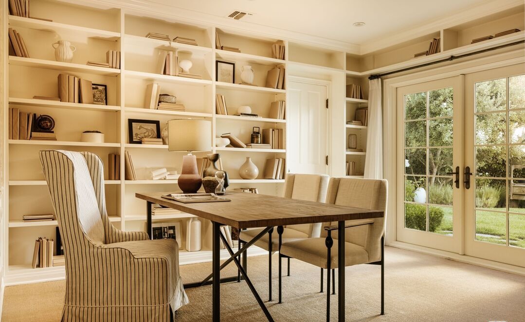 A sophisticated home office features extensive custom cream-colored built-in shelving with integrated accent décor, paired with a striking walnut desk on a black metal framework. The light-filled space opens to expansive views through French doors and tall windows, creating an airy, serene work environment enhanced by warm neutral tones, striped upholstered seating, and minimalist styling that balances storage with visual simplicity.
