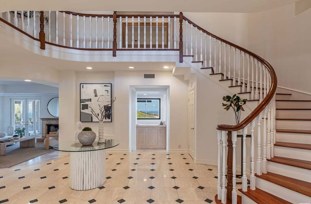 An elegant two-story entryway featuring a stunning curved staircase with dark wood handrailing and white balusters, anchored by a geometric marble floor with black diamond inlays. The space seamlessly blends traditional architectural details—crown molding, wainscoting, recessed lighting—with coastal-inspired color palettes and clean modern proportions, creating a sophisticated yet welcoming first impression.