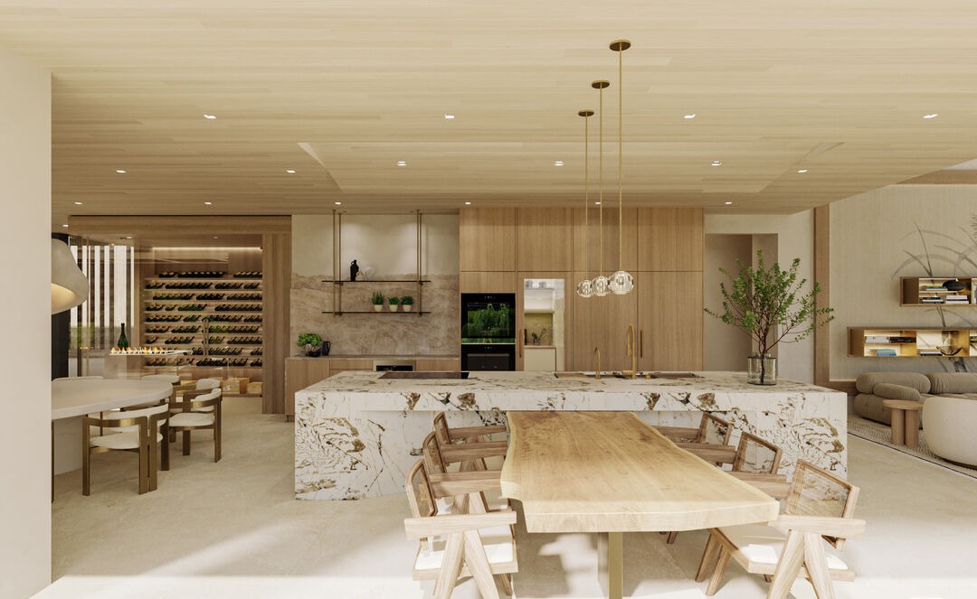 A stunning open-concept kitchen featuring a sculptural marble waterfall island with light wood base, anchored by brass pendant lighting and surrounded by integrated light wood cabinetry with stone backsplash and built-in wine storage. The space showcases warm earthy tones, abundant natural light, and sophisticated organic modern design with premium finishes and custom millwork throughout.