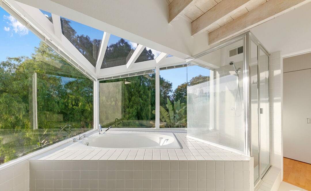 A stunning modern spa-inspired primary bathroom featuring a freestanding soaking tub positioned to capture panoramic views through expansive floor-to-ceiling windows, framed by exposed timber beams and abundant natural light from a skylight above. The minimalist palette of white large-format tiles, clean geometry, and frameless shower enclosure create a serene, resort-like sanctuary.