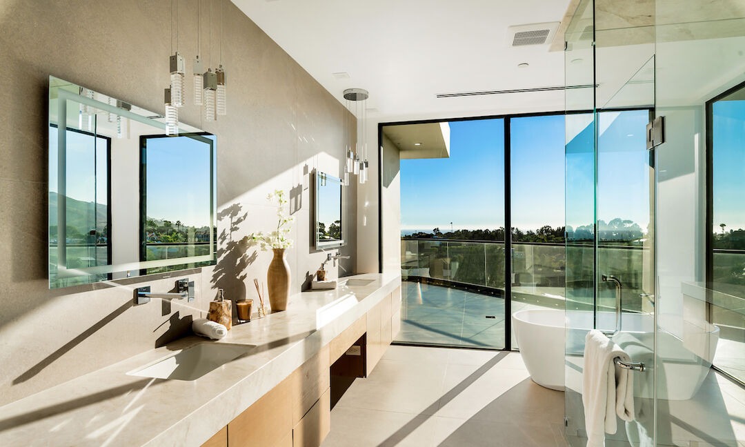Floor To Ceiling WindowsDouble VanityFloating VanityFrameless Glass ShowerFreestanding Soaking TubWalk In ShowerStatement LightingPendant LightingAbundant Natural LightHigh CeilingsOutdoor Views