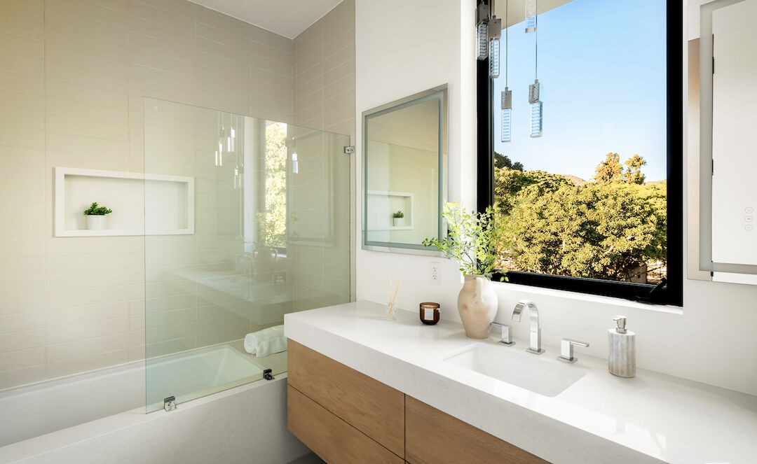 Floating VanityDouble SinkFrameless Glass ShowerBuilt In TubNiche ShelvingFloor To Ceiling WindowLarge Format TileRainfall Shower Head