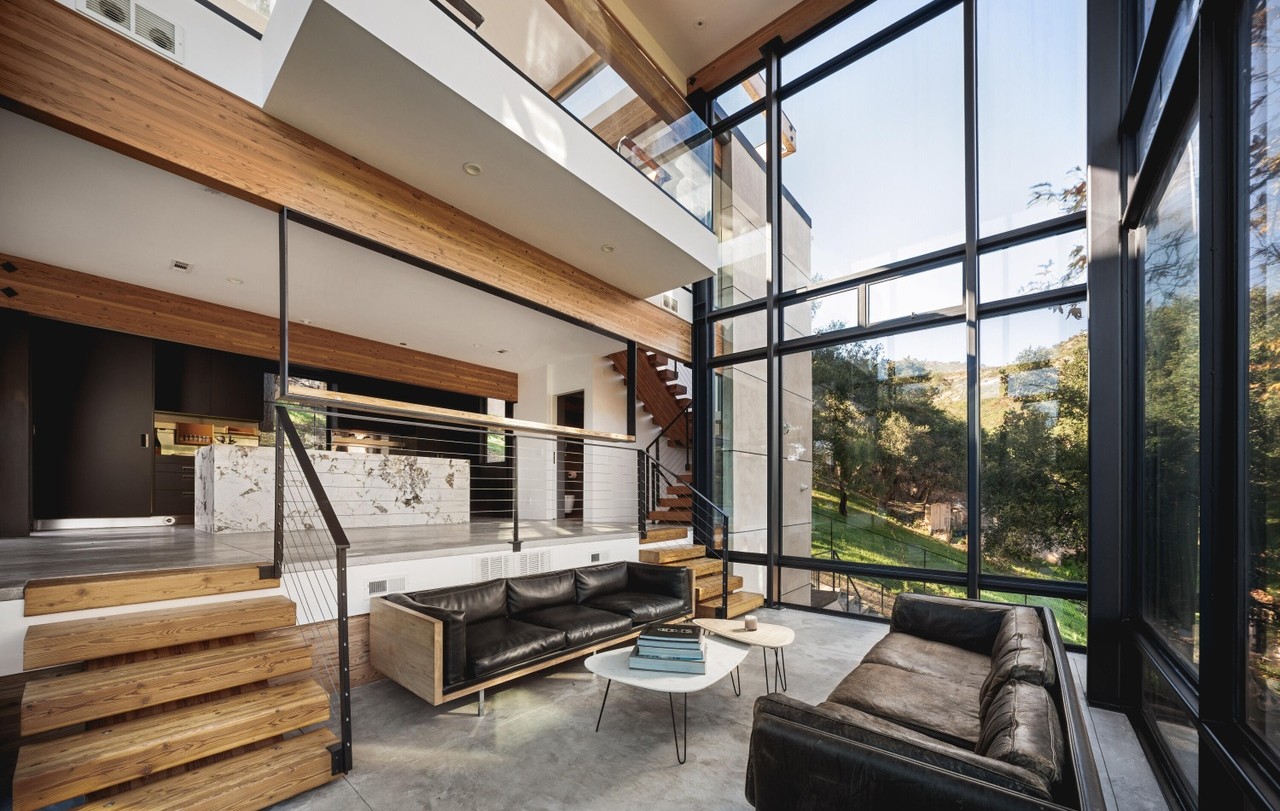 A soaring contemporary living space with dramatic floor-to-ceiling windows framing verdant landscape views, anchored by substantial natural wood beams and a concrete flooring plane that grounds the airy verticality. The design masterfully bridges indoor-outdoor living through expansive glazing and mixed material palette of warm wood, cool concrete, and blackened steel, creating a serene yet sophisticated atmosphere.