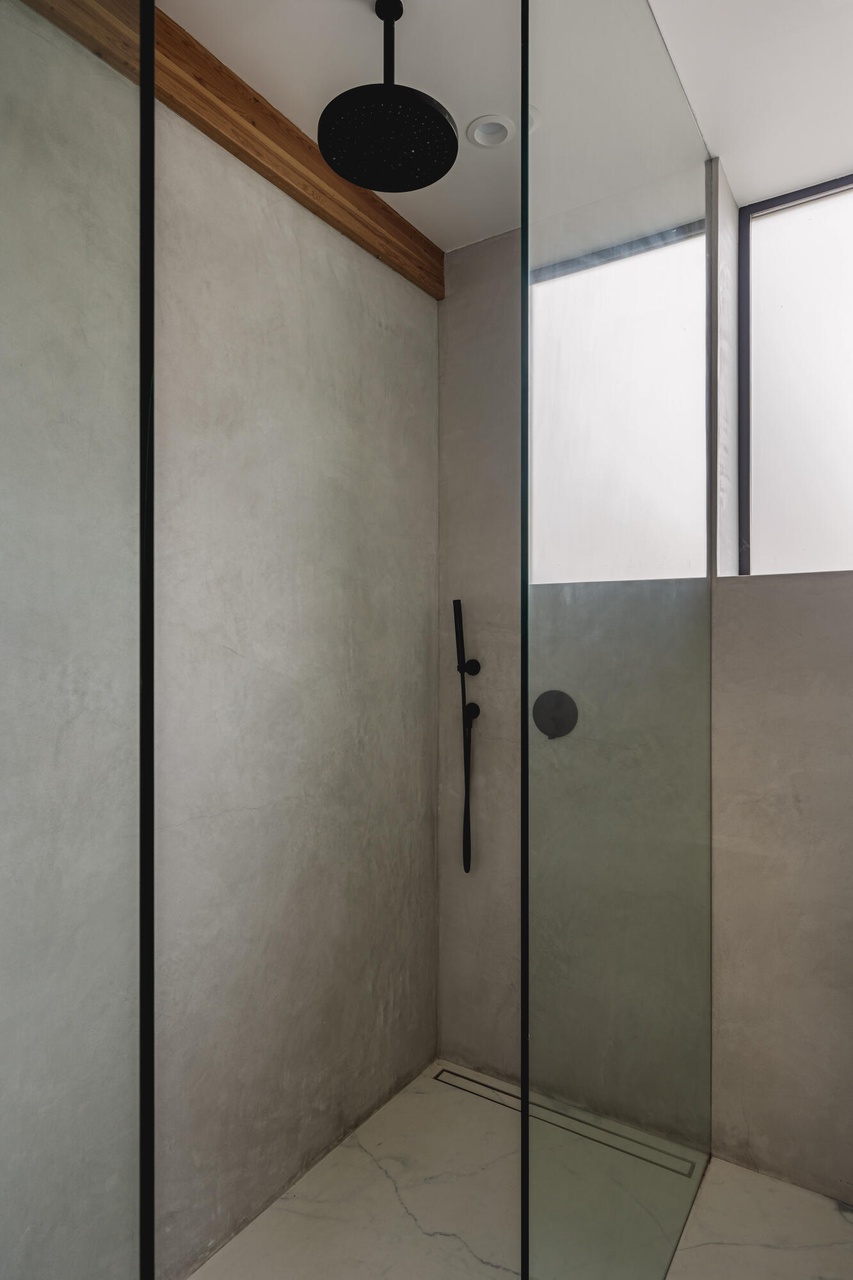 A luxuriously minimal walk-in shower featuring polished concrete walls, frameless glass enclosure, and striking black metal fixtures paired with a warm timber beam overhead. The spa-like design emphasizes clean lines, natural light, and restrained materiality for a serene, gallery-quality aesthetic.