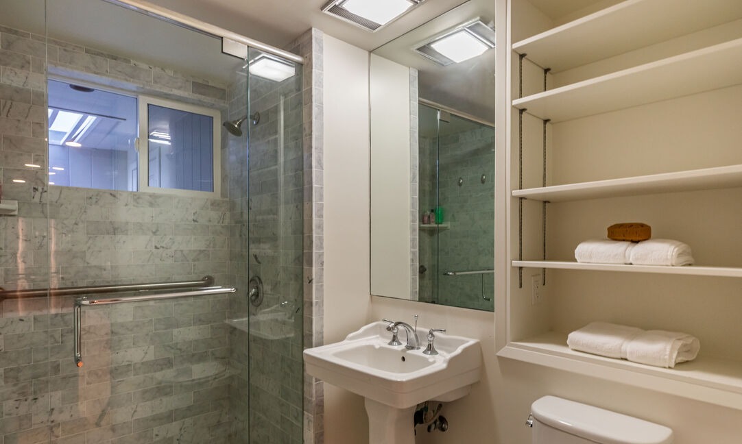 Walk In ShowerFrameless Glass ShowerSkylightOpen ShelvingPedestal SinkFloating ShelvesCustom Millwork