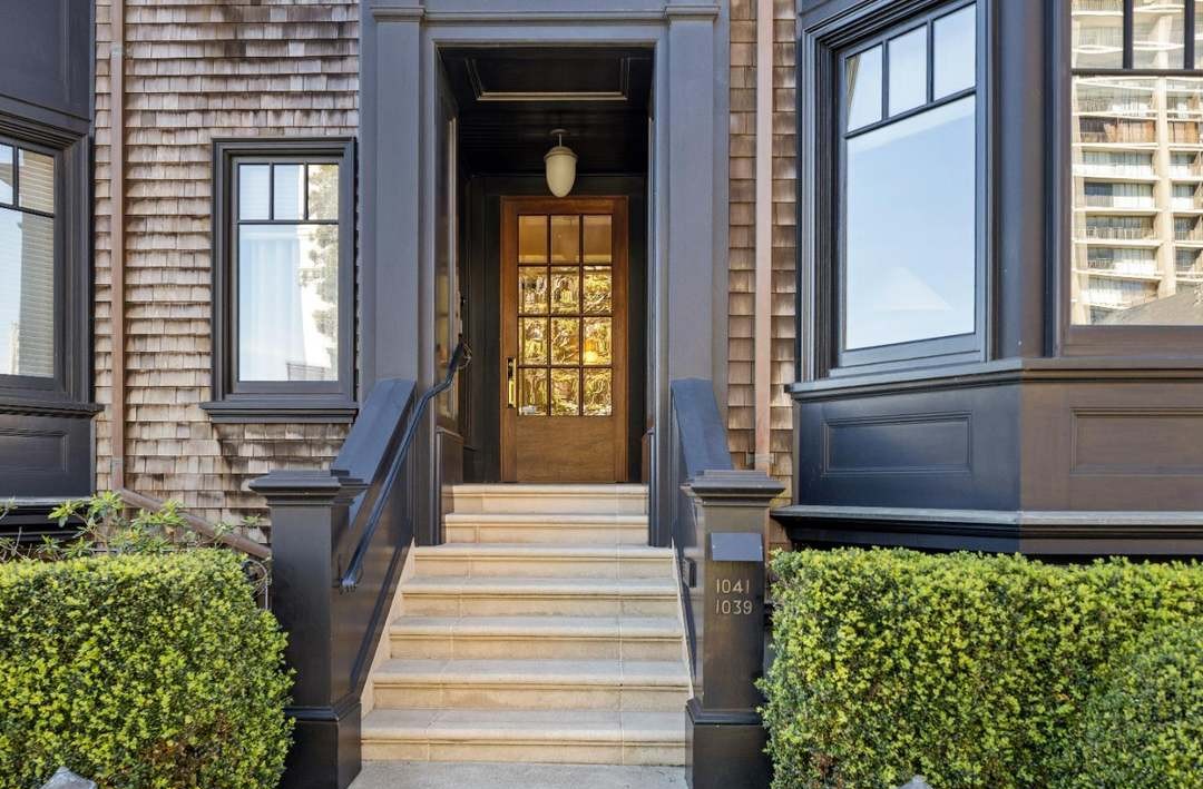 An elegant entryway featuring a warm wood door with glass panels framed by sophisticated gray-blue trim and traditional cedar shake siding. The concrete steps with black painted railings and brass hardware create a refined, welcoming approach that balances coastal New England heritage with contemporary sophistication.