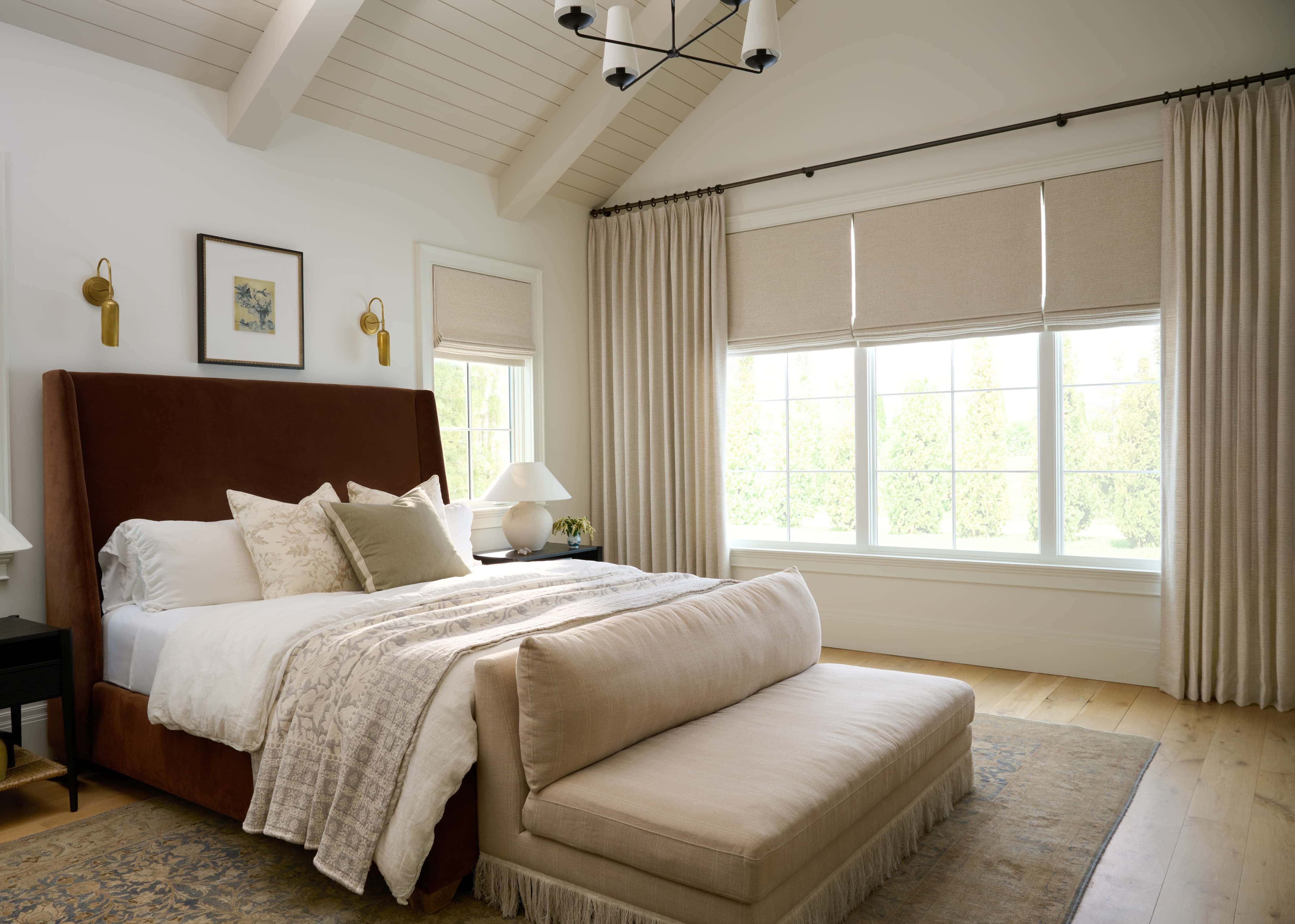 This sophisticated primary bedroom features a dramatic vaulted ceiling with exposed beams and abundant natural light from expansive windows dressed in layered Roman shades and linen curtains. The warm brown leather headboard anchors the space, complemented by brass sconce lighting, crisp white bedding, and a custom upholstered bench, creating an airy yet intimate retreat.