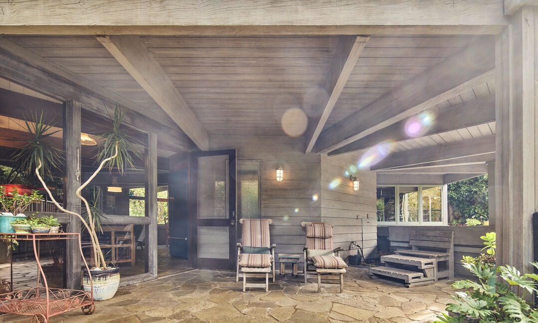 A sophisticated covered patio seamlessly blending indoor and outdoor living with elegant shiplap walls, exposed wooden beams, and a substantial stone floor. The space is anchored by a fireplace, furnished with striped lounge seating and accent plants, creating a warm yet refined retreat with abundant natural light and modern coastal sensibility.