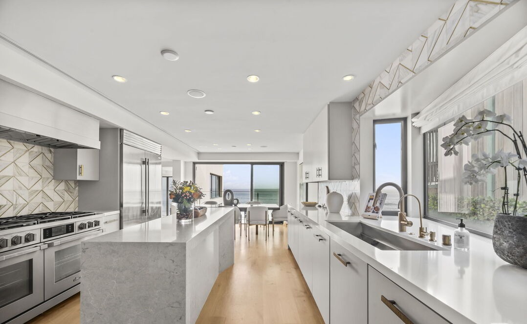A stunning contemporary luxury kitchen featuring a waterfall marble island, white flat-panel cabinetry, and herringbone tile backsplash, bathed in natural light from expansive windows overlooking coastal vistas. The space exemplifies high-end transitional design with brass hardware, warm hardwood floors, and seamless integration into an open-concept living area.