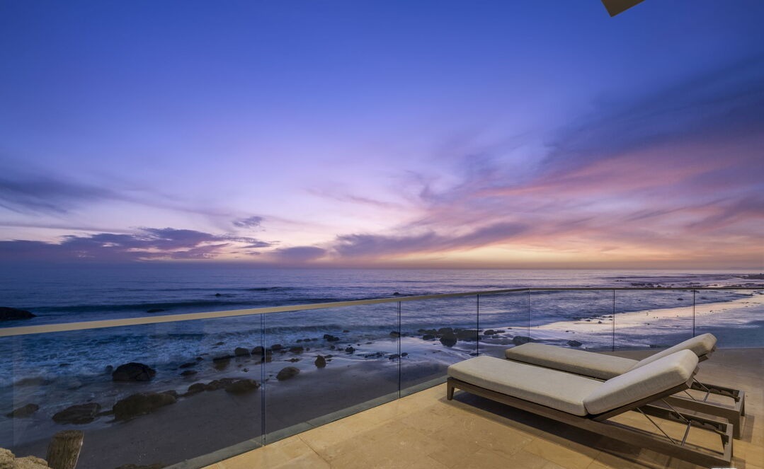 A breathtaking oceanfront patio featuring minimalist cream-upholstered loungers positioned to capture golden-hour sunset views over rocky coastline and open water. The space exemplifies ultra-luxury coastal living with its seamless indoor-outdoor integration, frameless glass railings, natural stone flooring, and editorial-quality composition enhanced by dramatic twilight sky and pristine ocean panorama.