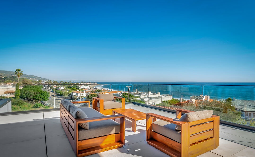 A stunning oceanfront patio featuring curated mid-century modern wooden lounge seating with custom cushioning, positioned to maximize panoramic coastal views framed by glass railings. The design seamlessly blends indoor-outdoor living with premium materials and sophisticated color restraint, epitomizing contemporary California coastal luxury.