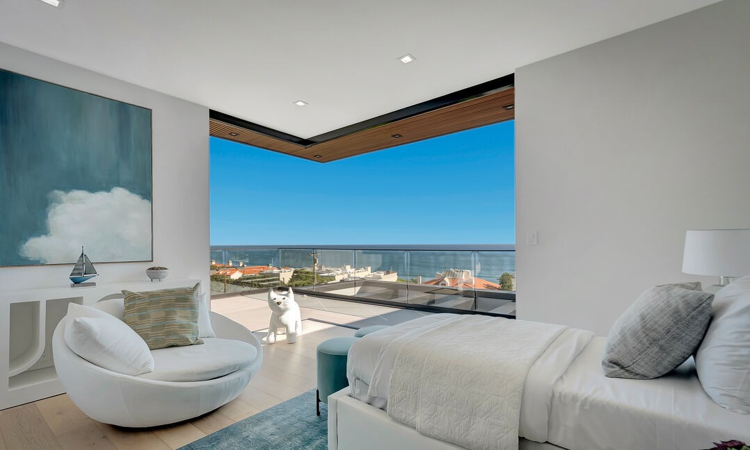 A stunning contemporary primary bedroom suite with floor-to-ceiling ocean views framed by frameless glass railings, featuring soft coastal tones of white, cream, and teal accented by warm wood ceiling details. The space balances minimalist furnishings with organic textures and curves, creating a serene, sophisticated sanctuary elevated by abundant natural light and museum-quality finishes.