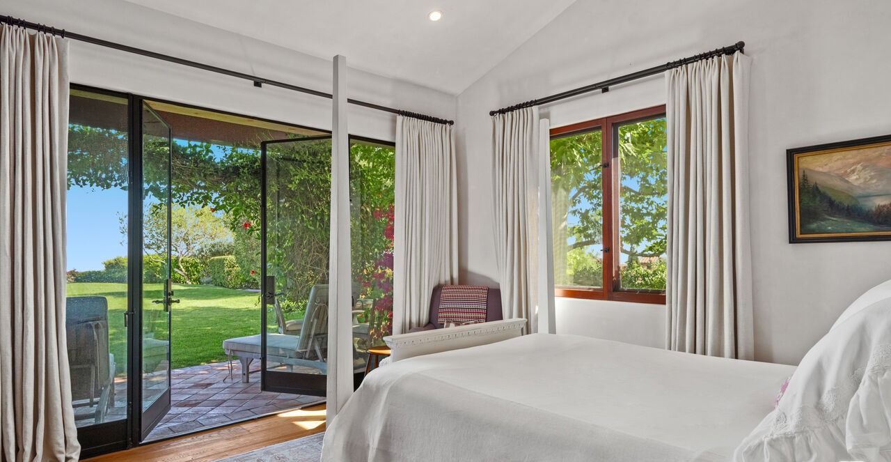 An elegant primary bedroom suite featuring abundant natural light through expansive glass doors and windows framing manicured landscape views, with a sophisticated blend of transitional and organic modern design. The space showcases a serene palette of whites and creams complemented by natural wood flooring, black-framed glazing, and a charming window seat, creating a luxurious yet airy retreat with seamless indoor-outdoor connectivity.