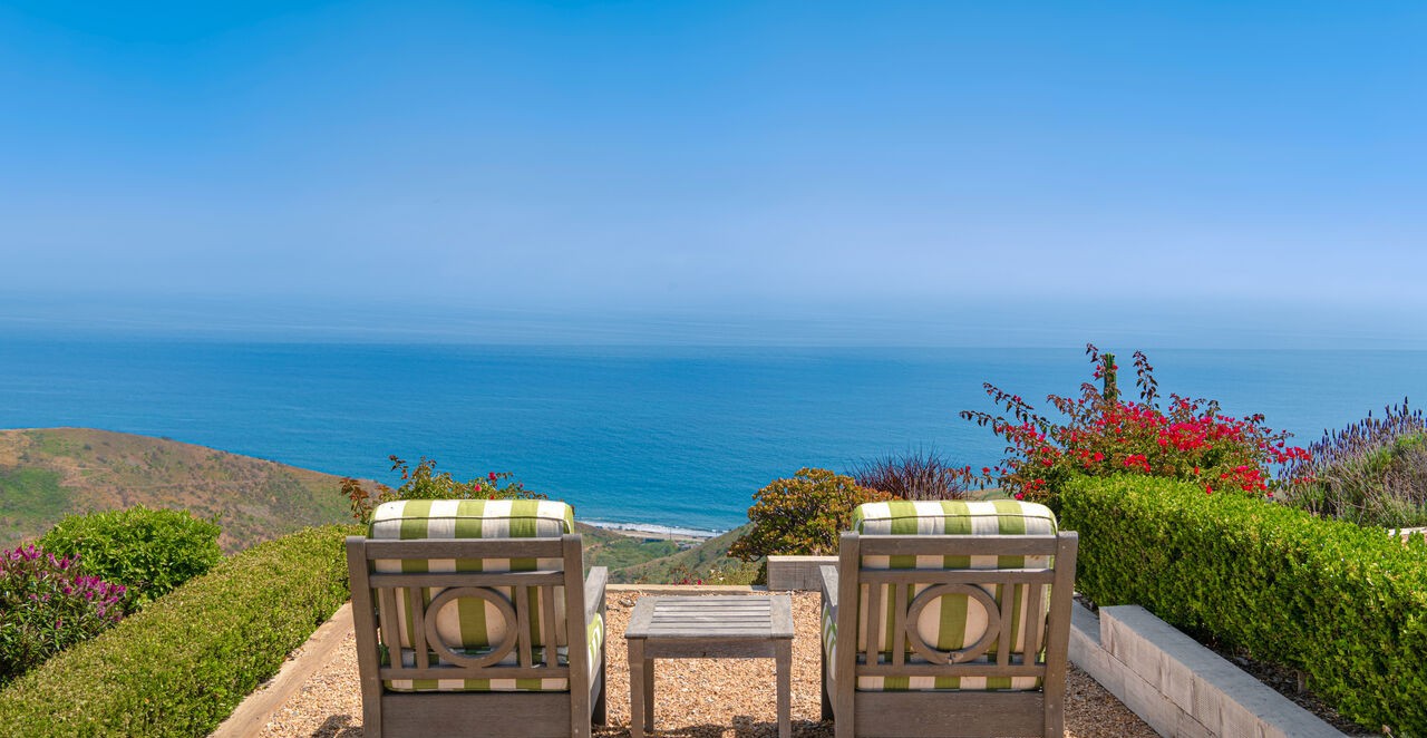 An elevated cliffside patio with commanding views of pristine blue ocean waters, featuring striped lounge chairs positioned to maximize the panoramic seascape and vibrant coastal gardens with flowering plants and sculpted hedges. The space exemplifies luxury coastal living with natural stone flooring, refined outdoor furniture, and an unobstructed connection to the Mediterranean-like landscape.