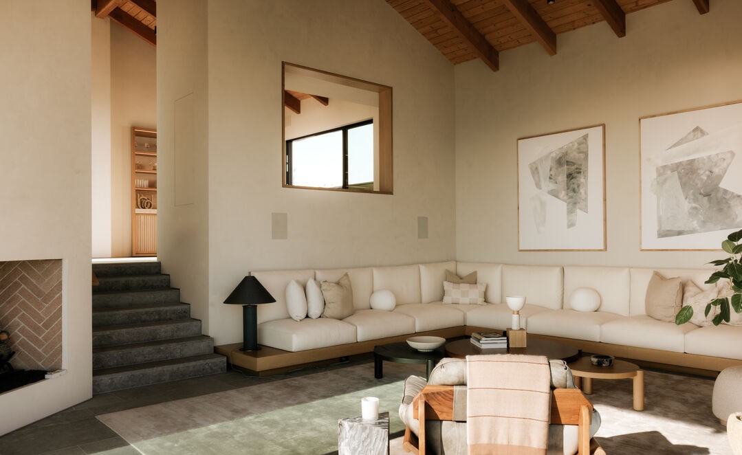 A serene, sophisticated living room that exemplifies organic modern design with warm, neutral tones and natural materials throughout. The space features exposed wooden beams, a custom built-in cream linen seating arrangement with integrated wainscoting, a herringbone brick fireplace, and abundant natural light from a strategically placed skylight, creating an airy yet intimate sanctuary with carefully curated minimalist furnishings and muted artwork.