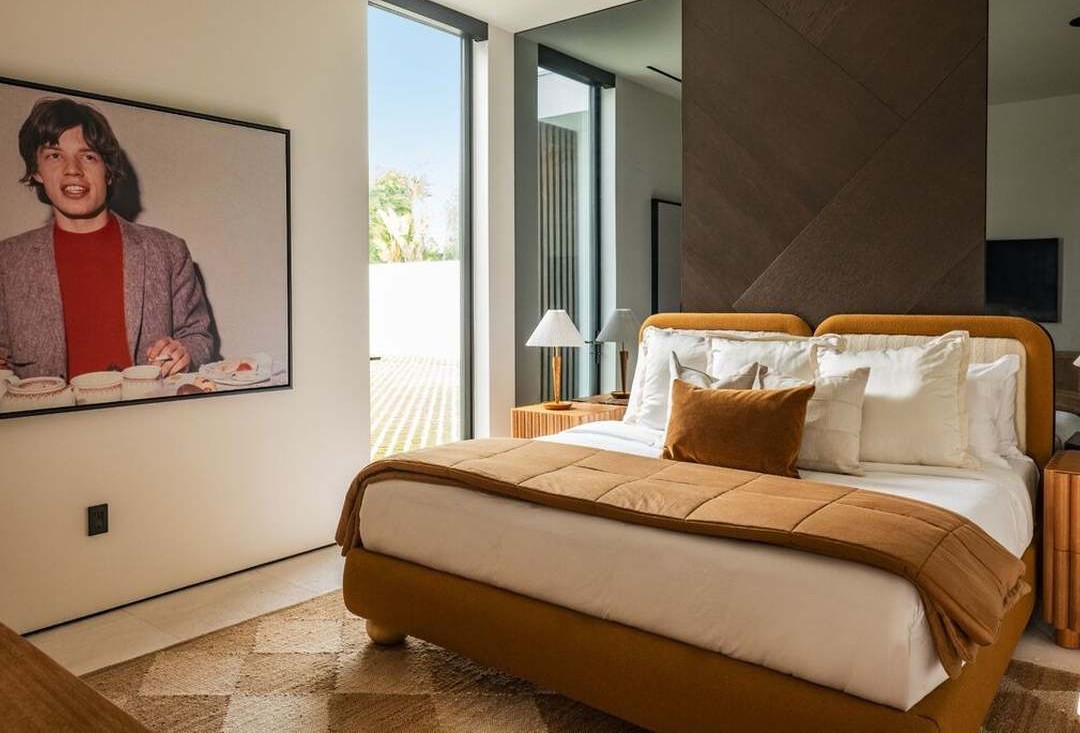 A serene, sunlit primary bedroom featuring a warm-toned wood bed frame with layered cream and caramel linens, anchored by an iconic vintage portrait and complemented by geometric wood wall paneling. The space balances organic warmth with modern minimalism through natural materials, abundant glazing, and thoughtful accent lighting, creating a sophisticated retreat with strong Southern California design influence.