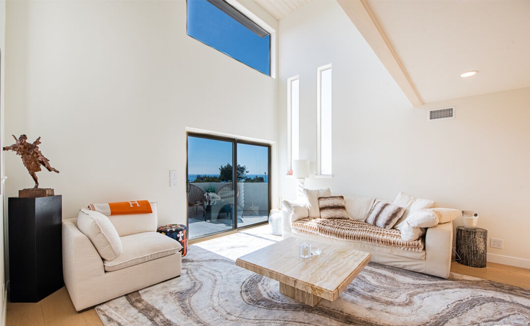 A luminous coastal-modern living room anchored by high ceilings, expansive windows framing ocean views, and warm neutral furnishings in linen and natural materials. The space balances organic textures with clean-lined upholstery and a sculptural travertine coffee table, creating sophisticated yet relaxed luxury.