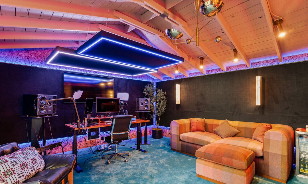 A cutting-edge home entertainment suite featuring dramatic black walls, a vibrant orange sectional sofa, and statement neon-blue rectangular lighting fixtures suspended from a striking exposed wood beam ceiling. The space showcases maximalist glam design with layered ambient lighting, professional music production equipment, and a bold color palette that balances sophistication with playful energy.