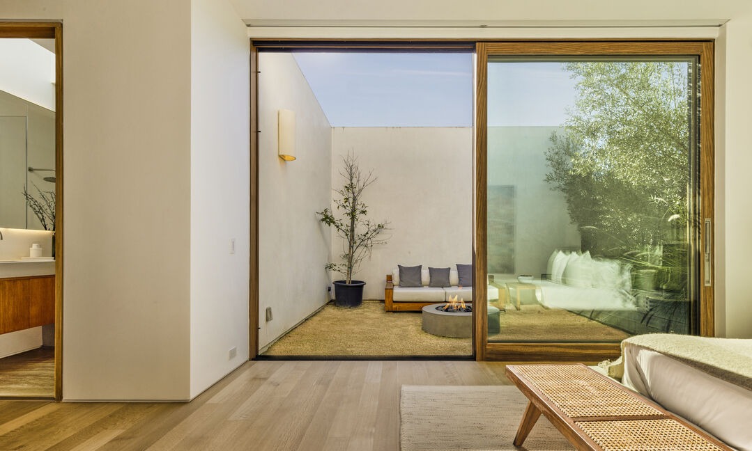 A sophisticated primary bedroom suite featuring seamless indoor-outdoor integration through expansive floor-to-ceiling glass doors opening to a private minimalist courtyard with mature trees and fire pit seating. The warm minimalist interior combines light hardwood flooring, soft neutral walls, and carefully curated modern furnishings with natural textures, creating a serene sanctuary with abundant natural light and exceptional design restraint.