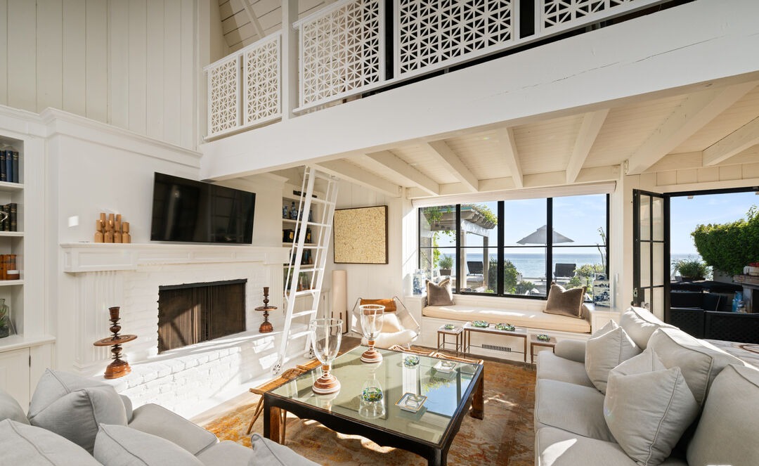 A stunning high-ceilinged great room with exposed beams, a white brick fireplace, and expansive ocean-view windows framing a coastal landscape. The space masterfully blends traditional architectural elements—coffered ceilings, crown molding, built-in shelving—with contemporary furnishings and a sophisticated, serene palette of whites, creams, and warm wood tones, anchored by a striking black coffee table and geometric-patterned decorative screens.