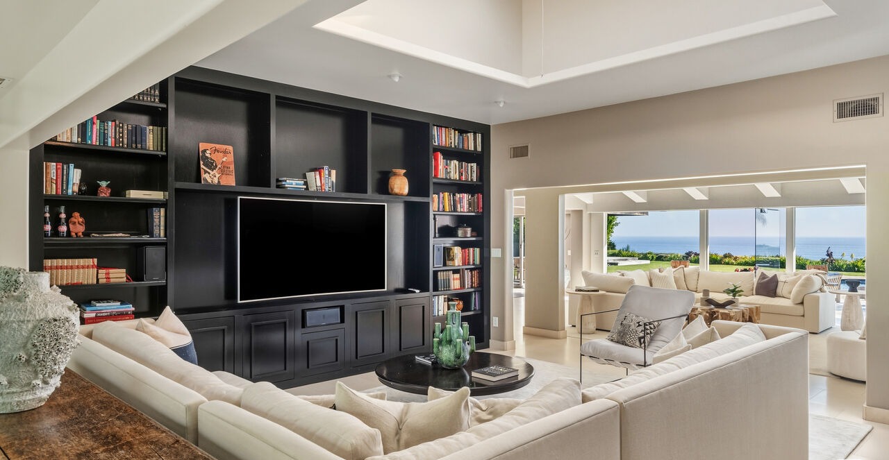 A sophisticated open-concept family room featuring a striking black custom media wall with integrated shelving, cream sectional seating, and expansive ocean-view windows framing a serene coastal landscape. The coffered ceiling and carefully curated furnishings balance dramatic architectural elements with warm, inviting materials to create a luxurious yet livable sanctuary.