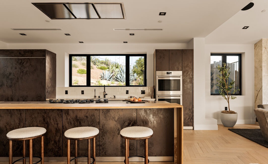 A sophisticated kitchen featuring dark textured cabinetry paired with warm butcher-block countertops and a striking waterfall island, unified by warm earth tones and black hardware. The open-concept layout with abundant natural light and high ceilings creates an airy yet warm atmosphere, exemplifying contemporary luxury with organic, tactile material choices.