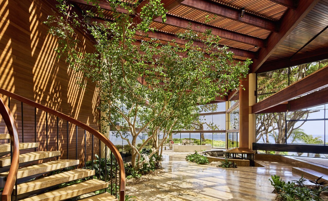 A sophisticated covered patio bathed in warm, filtered sunlight through a slatted pergola overhead, featuring dramatic exposed wooden beams and lush hanging vegetation creating a serene indoor-outdoor living space. The warm wood tones, natural materials, and floor-to-ceiling windows overlooking a landscape exemplify modern desert living with organic elegance and exceptional attention to natural light and material warmth.